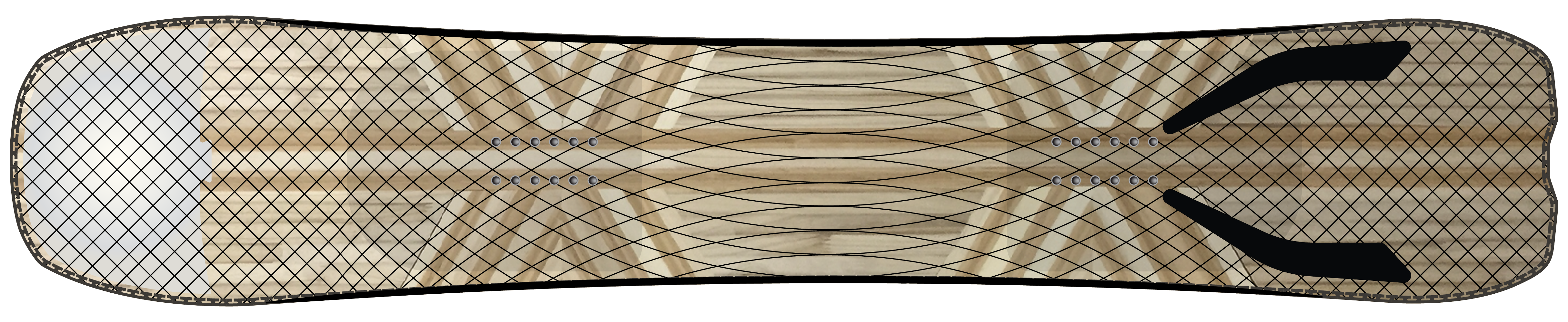 - Spectral braid (alchemist): интегрированная карбоновая оплетка, проходящая по всей длине доски, пересекающаяся под углом 90º в кончике и хвосте для увеличения торсионной жесткости и отзывчивости, а также более мягкий угол между вставками для управляемости и маневренности